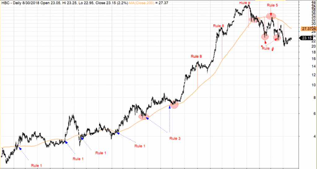 - Rule 4 cung cấp các tín hiệu mua ngắn hạn trong xu hướng giảm giá dài hạn khi MA200 ngày bị dốc xuống và giá các xa đường MA200. Bằng cách đo lường khoảng cách giữa giá và MA200 tại các đáy trước, chúng ta biết rằng, giá hiện tại có cách xa đường MA200 hay không. Hình trên cho thấy, các đáy của HBC đều có cùng môt khoảng cách như nhau so với đường MA200 đang dốc xuống. Đó là những cơ hội mua ngắn hạn. Nhưng một lần nữa lưu ý, trader có thực hiện tín hiệu này phải chú ý momentum dài hạn đang cho xu hướng giảm.
